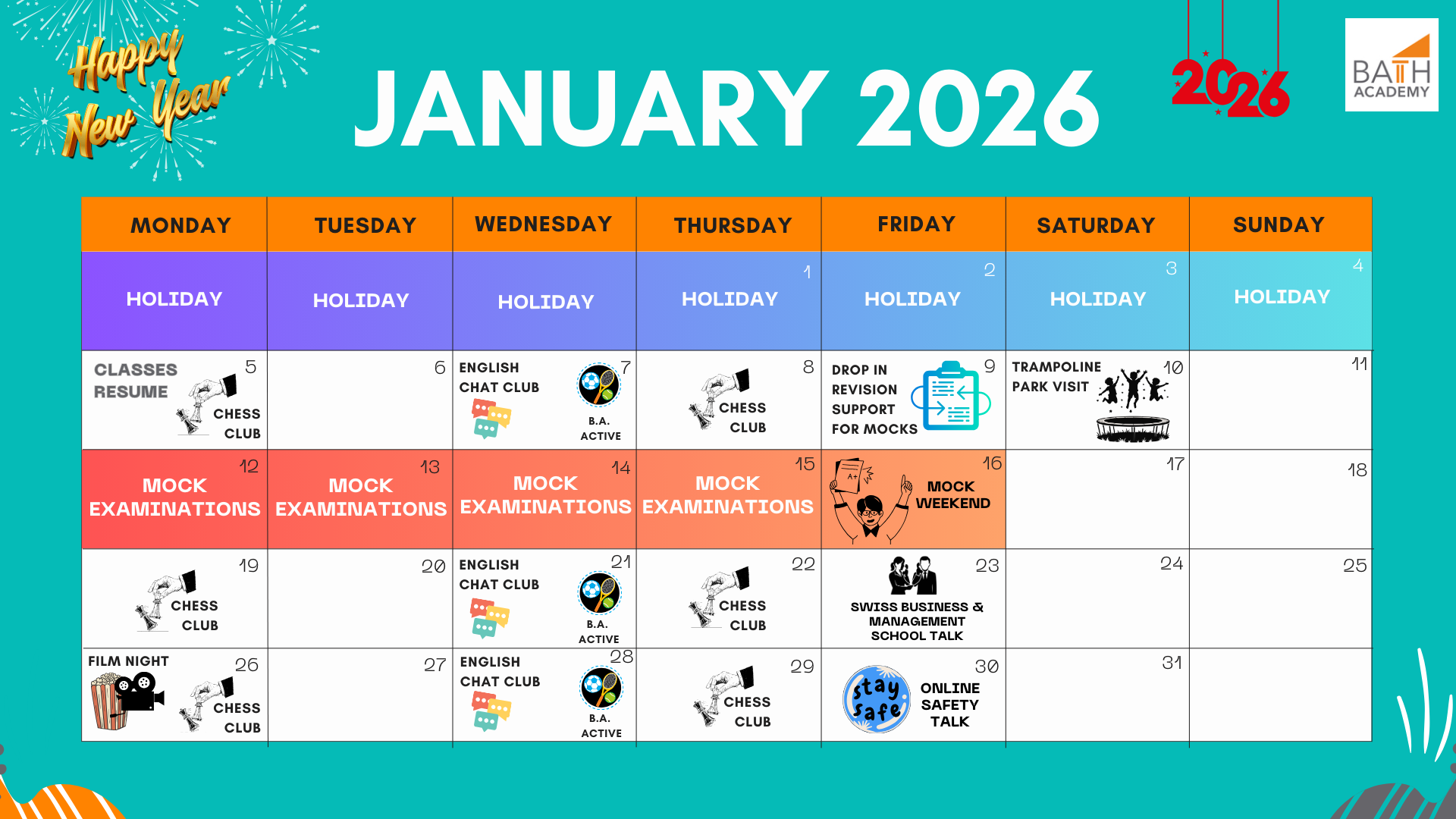 Monthly activities are posted on student notice boards, social media, and can also be found in our Parent & Student Newsletters.